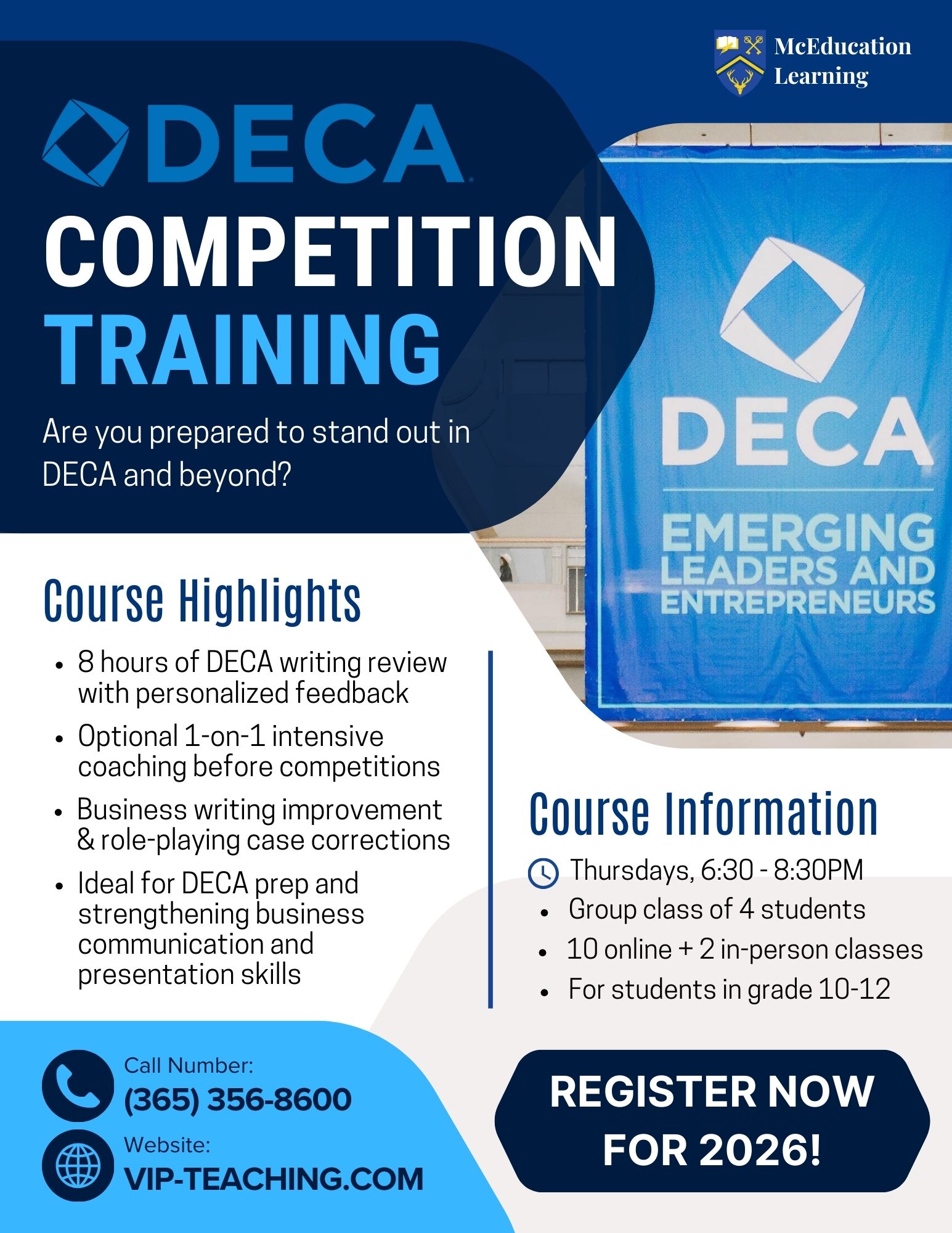The DECA Competition Training course is designed for students in Grades 10–12 who want to stand out in DECA and build strong business communication skills. This program focuses on improving DECA writing, presentation delivery, and role-play performance through targeted instruction and personalized feedback. Students participate in DECA writing reviews, business writing improvement, and role-play case corrections to sharpen their responses and confidence. Optional one-on-one intensive coaching is available to help students prepare for competitions and refine their performance. This course is ideal for DECA members seeking focused preparation, stronger communication skills, and a competitive edge.