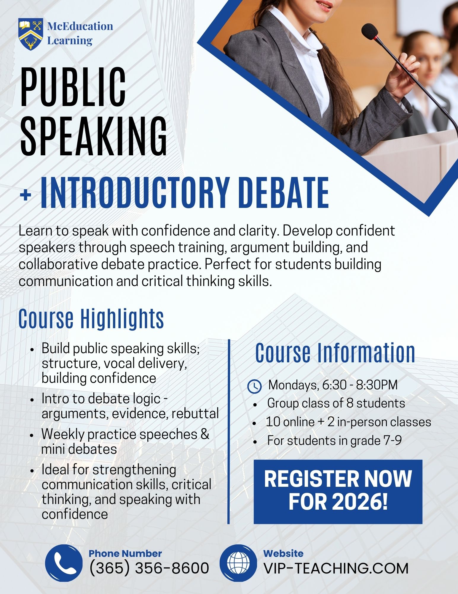 The Public Speaking + Introductory Debate course helps students in Grades 7–9 develop confidence, clarity, and critical thinking through structured speech training and collaborative debate practice. Students learn how to organize ideas, speak persuasively, and defend arguments using logic and evidence. Through weekly practice speeches and mini-debates, students strengthen vocal delivery, communication skills, and the ability to think on their feet. These skills directly support success in presentations, leadership opportunities, and DECA competitions, where clear communication and confident responses are essential. This course is ideal for students looking to build strong public speaking foundations while preparing for academic, competitive, and real-world speaking situations.