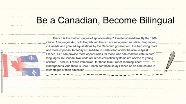 French is the mother tongue of approximately 7.2 million Canadians.By the 1969 Official Languages Act, both English and French are recognized as official languages in Canada and granted equal status by the Canadian government. It is becoming more and more important for today’s Canadian to understand and/or be able to speak French, as it can provide more opportunities for those who can communicate in both languages. In Canada, two kinds of French education systems are offered to young children. There is French Immersion, for those take French learning since kindergartens. And there is Core French, for those study French as a core course in later stages of their education.
