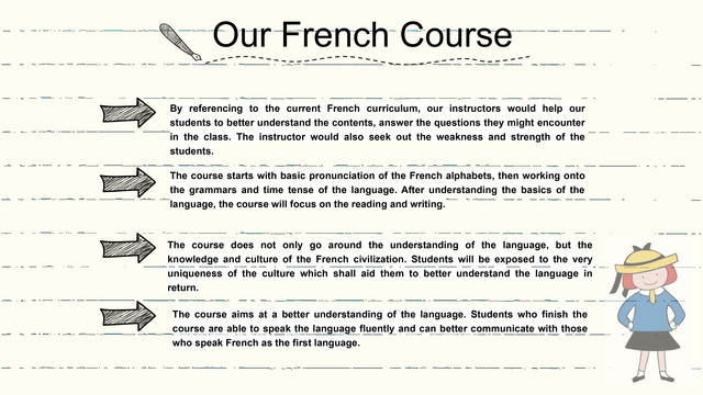 By referencing to the current French curriculum, our instructors would help our students to better understand the contents, answer the questions they might encounter in the class. The instructor would also seek out the weakness and strength of the students.