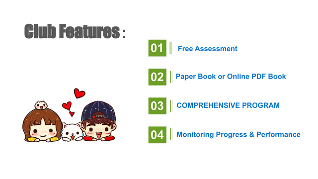 Membership APP/month$80 (24 books/6 monthsï¼›48books/12 months): assign 4 e-books every month + word practice + grammar test + reading report correction + reading report sharing and presentation once a month either online or in-person