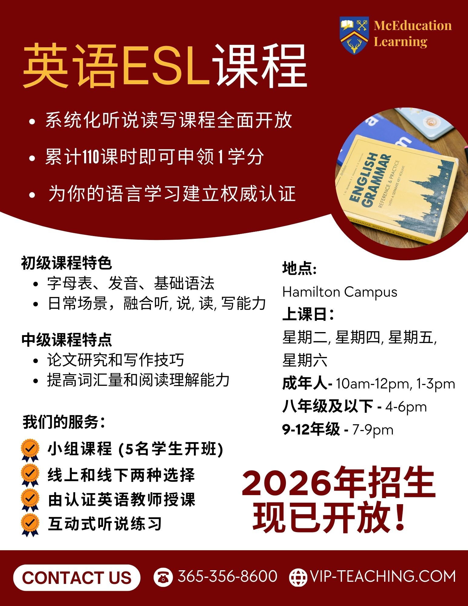 我们的英语作为第二语言(ESL)辅导项目旨在帮助学习者提升听说读写能力。该项目面向所有水平的学生,注重实用沟通、学术英语发展以及通过互动式教学增强自信心。学生每完成110小时的ESL学习即可获得1个学分。课程由持有教师资格证的英语教师提供线上和线下两种授课方式。